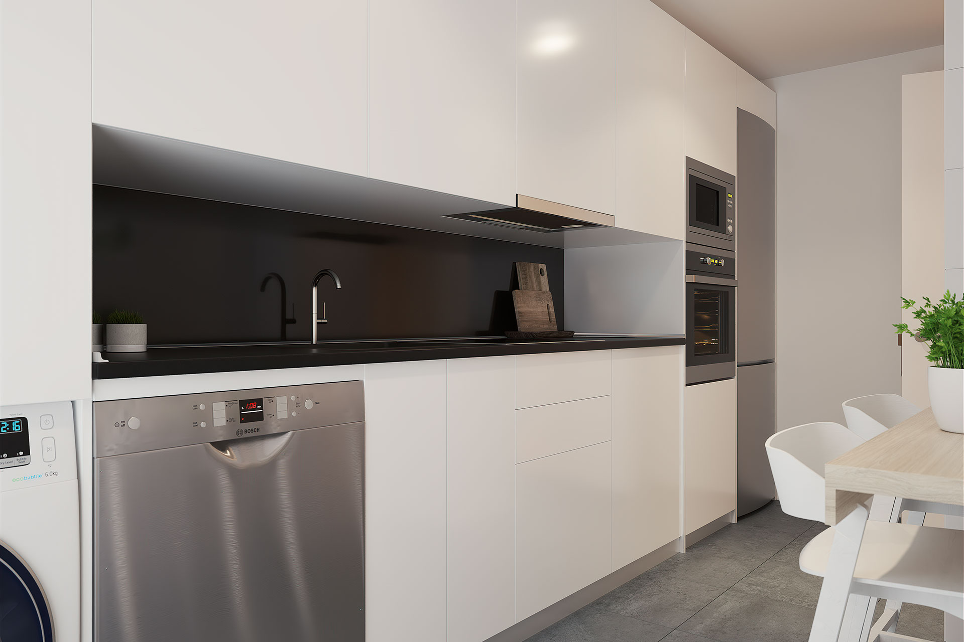 Práctico diseño de cocina con armarios altos y bajos de gran capacidad, encimera y frente de cuarzo.